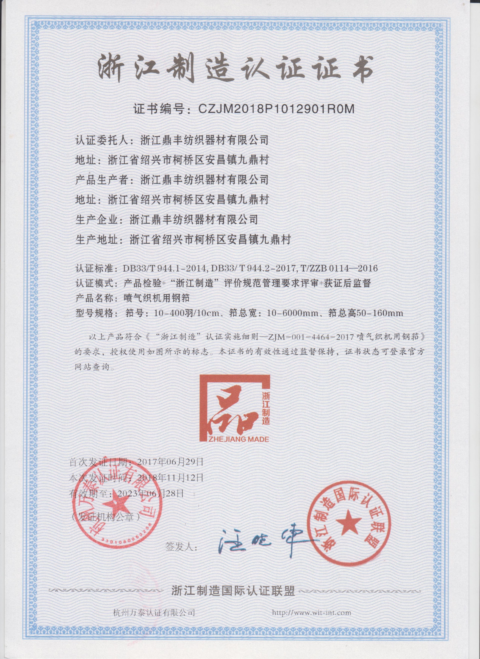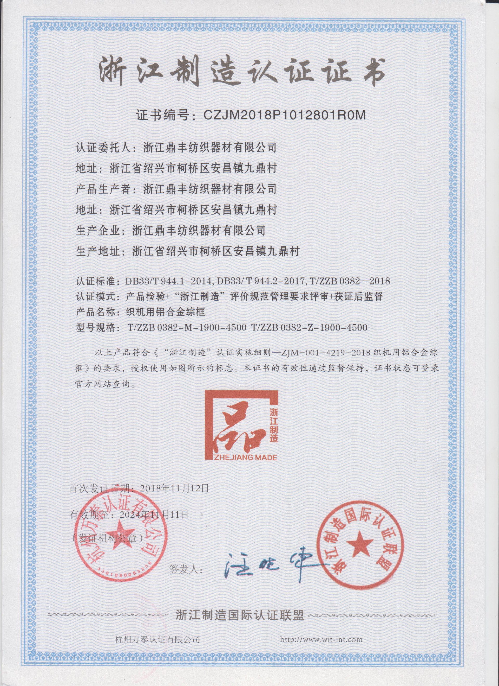 浙江鼎豐紡織器材有限公司始建于1986年,是一家專業生產各類無梭織機用鋼筘:噴氣筘、噴水筘、劍桿筘、其他類型鋼筘;鋁合金綜框、鋼片綜、停經片、經軸、織軸、卷布輥等產品及配件的民營企業。